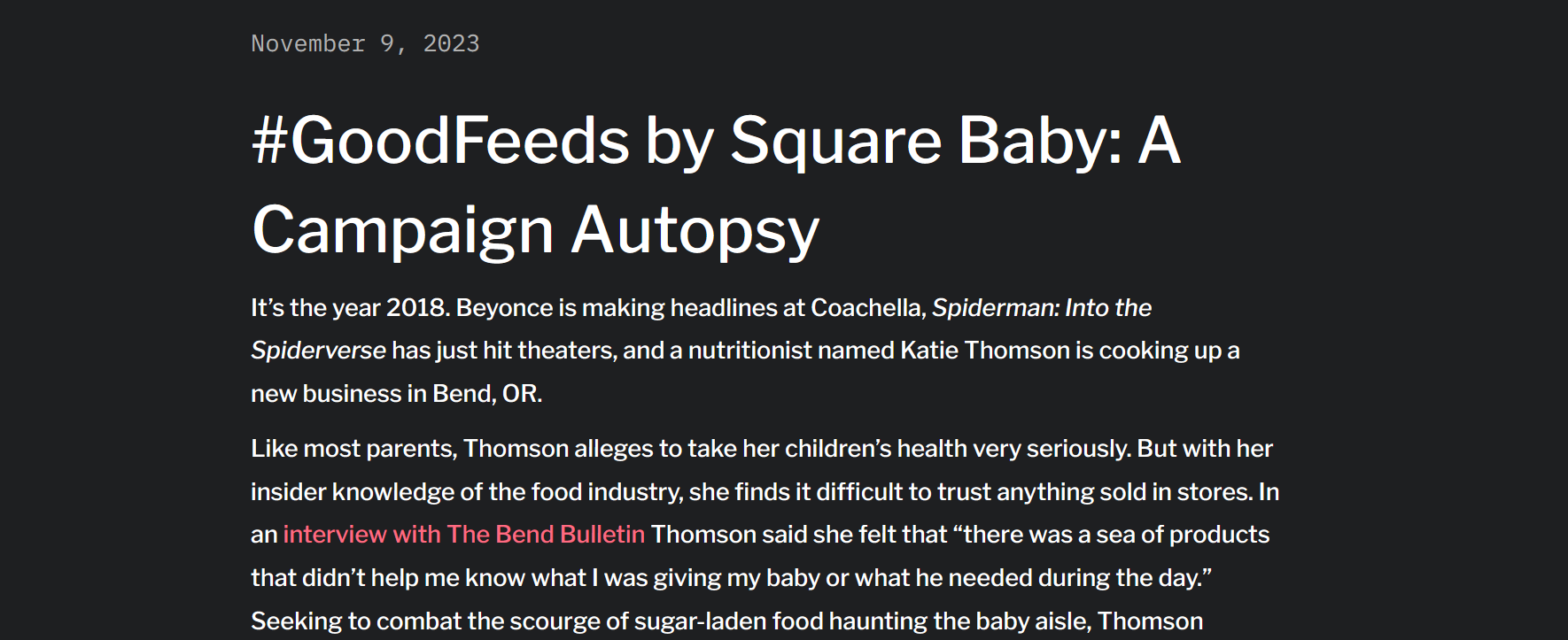 In fall of 2023, an Oregon-based nutritional baby food company called Square Baby launched their #GoodFeeds campaign, in which the company pledged to donate to No Kid Hungry for every post their followers made using the hashtag #GoodFeeds. During this time, I conducted a comprehensive case study of the campaign to analyze the social media strategies behind its performance. This project involved meticulously tracking hundreds of posts as well as all user-generated content across multiple platforms, delving into engagement metrics, and evaluating website data to assess the campaign’s effectiveness. By synthesizing these insights, I identified key strengths, pinpointed areas for improvement, and provided actionable recommendations to enhance future efforts.