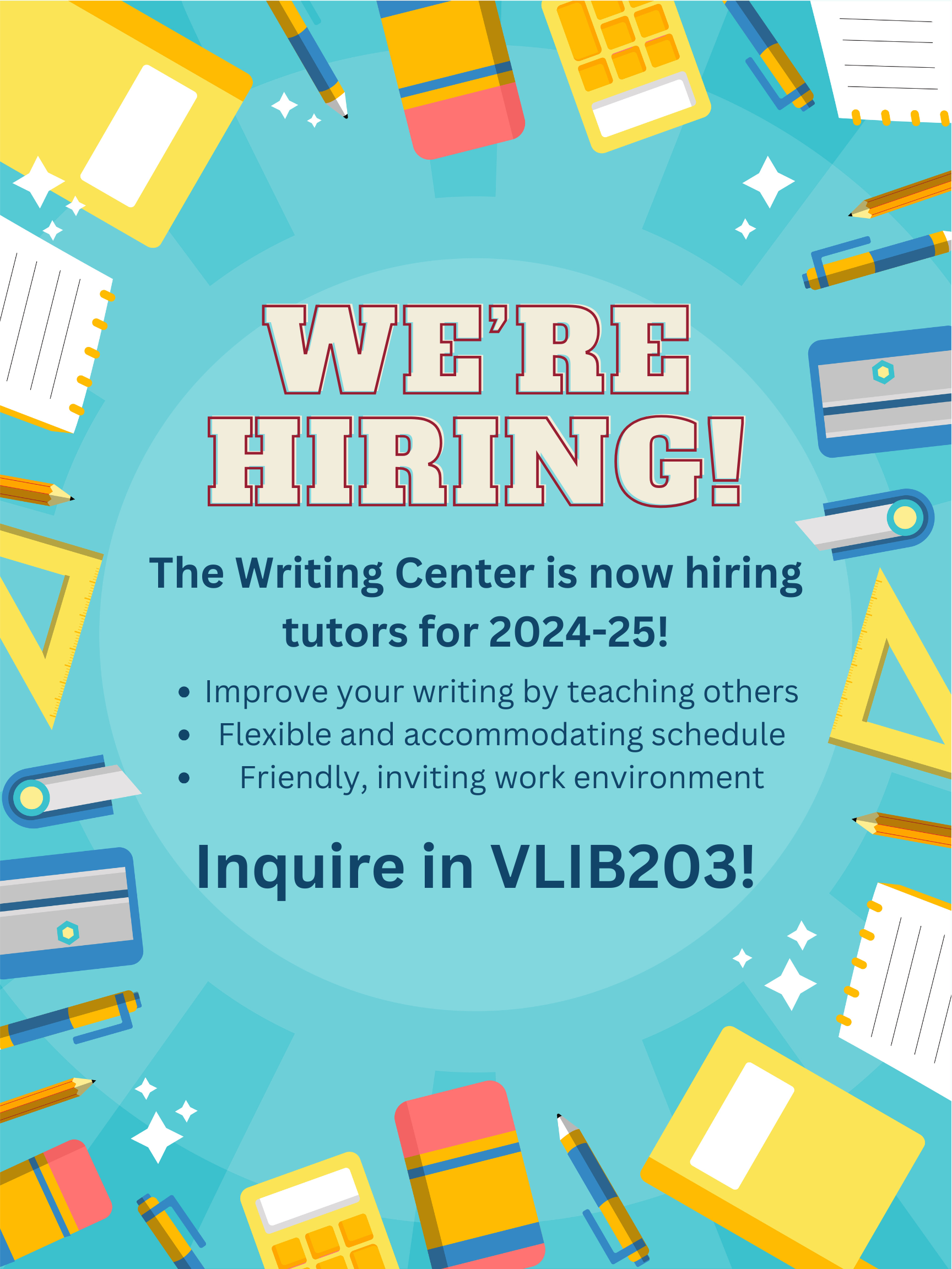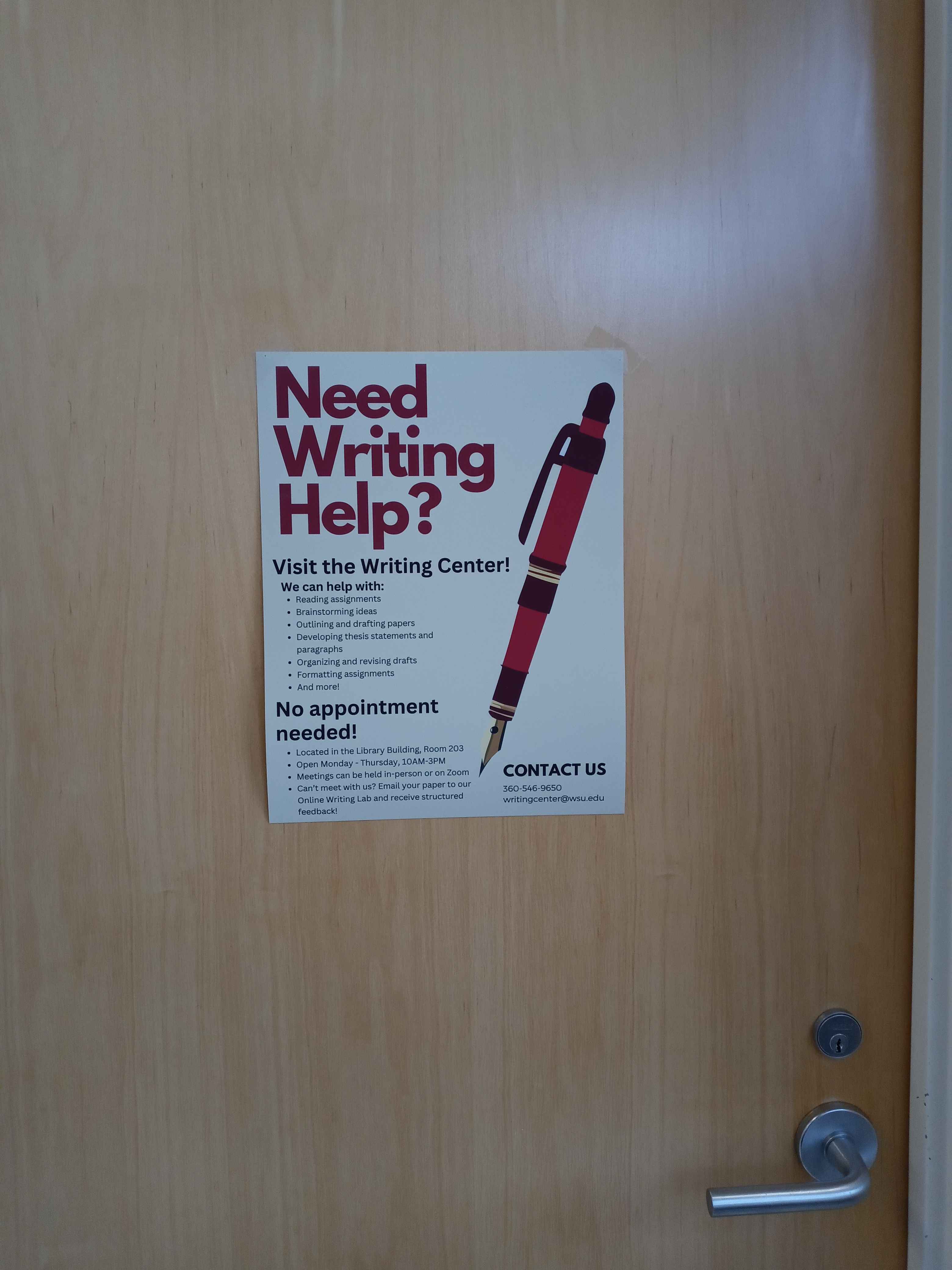 Beyond my core consulting duties, I contributed to the Writing Center’s outreach efforts as a creative and enthusiastic ambassador. I designed promotional flyers for campus-wide distribution and represented the Writing Center at various campus events, raising awareness of our services and encouraging them to take advantage of the support we offered. This combination of academic consulting and promotional work allowed me to sharpen my skills at communication, design, and collaboration while cultivating a welcoming and inclusive learning environment for everyone at the Center.